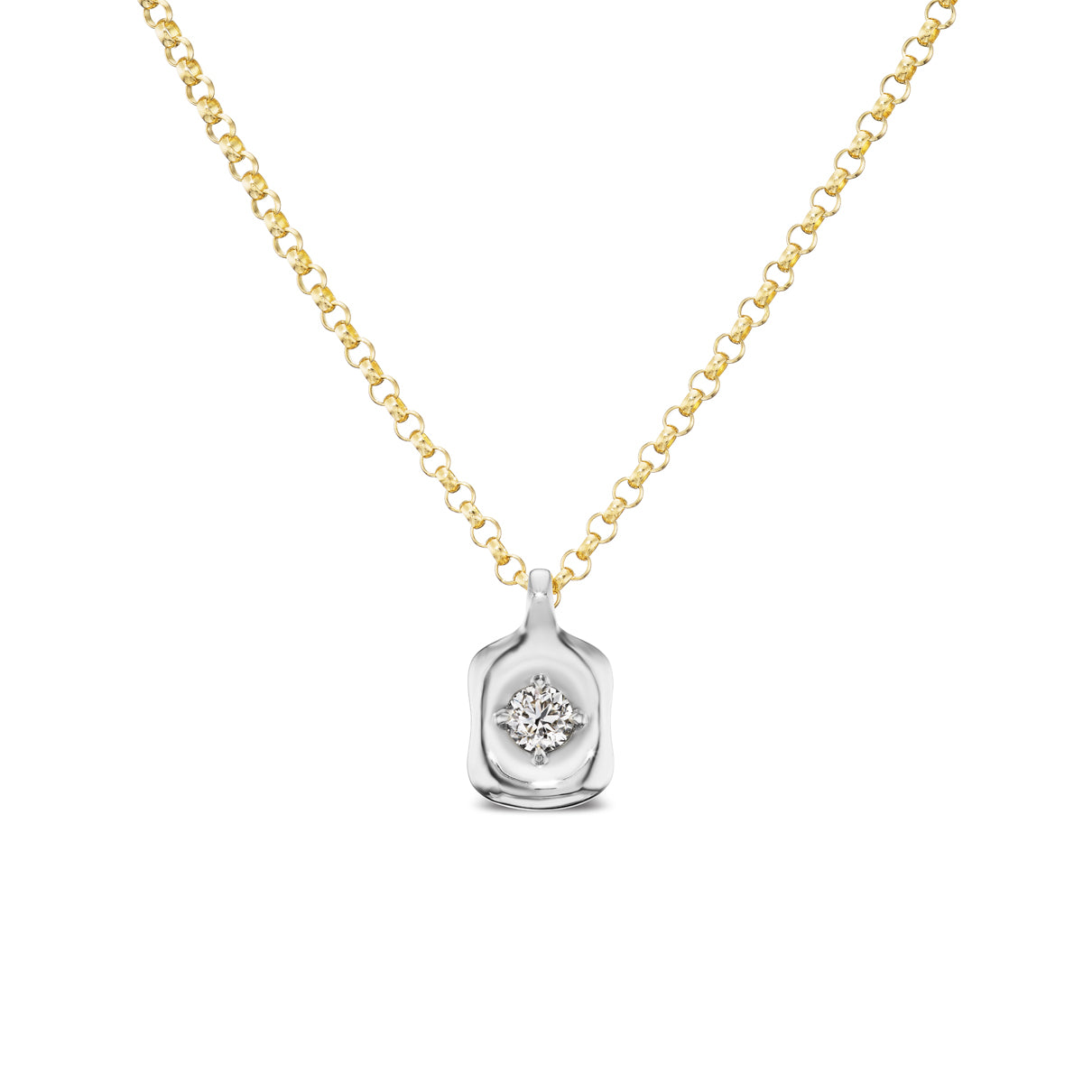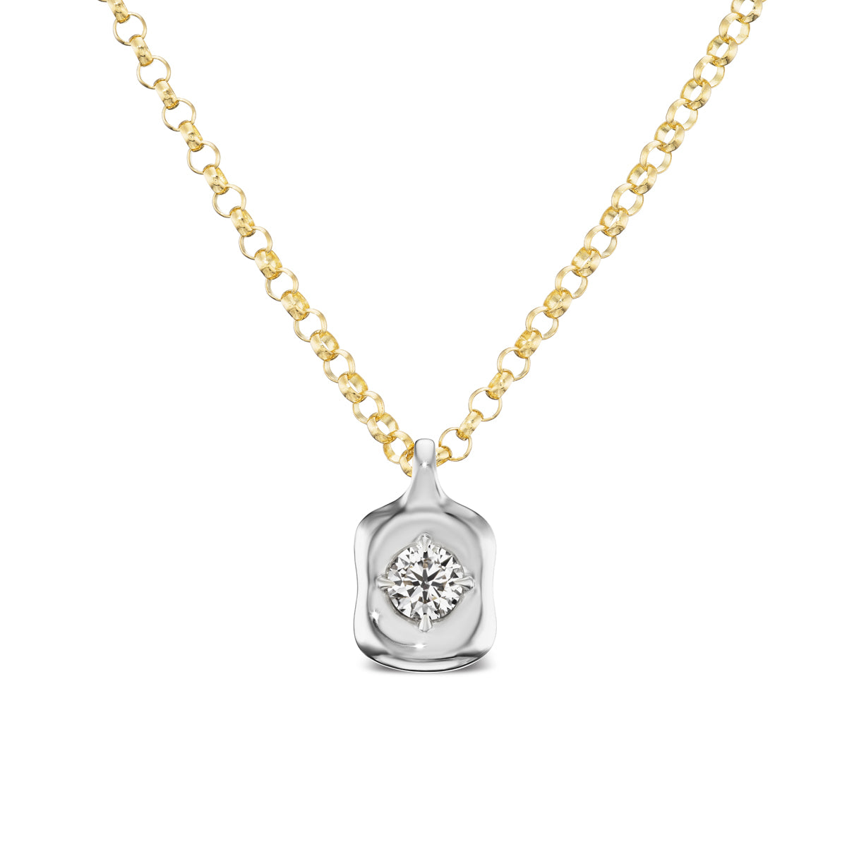 Part of the Nebula collection, this necklace features a .5 carat round modern natural diamond, set in our pillowy mounting. It is paired with our 2.4mm 18 inch Rolo chain, with a jump ring at 16 inches for the option of a shorter look.