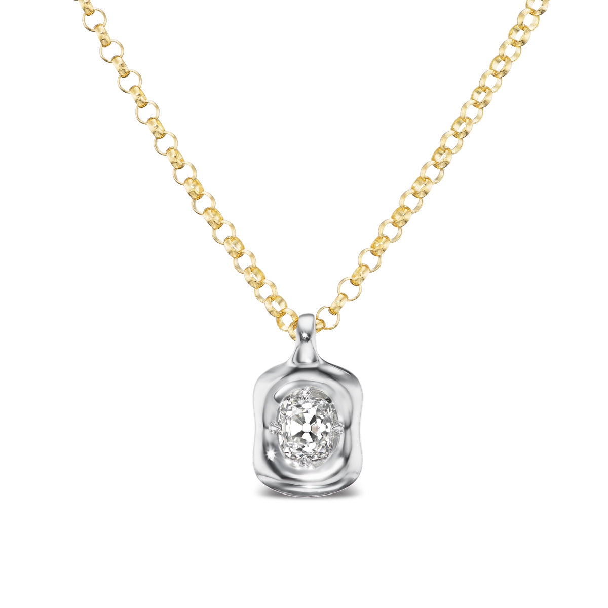 Part of the Nebula collection, this necklace features a 1 carat round modern natural diamond, set in our pillowy mounting. It is paired with our 2.4mm 18 inch Rolo chain, with a jump ring at 16 inches for the option of a shorter look.