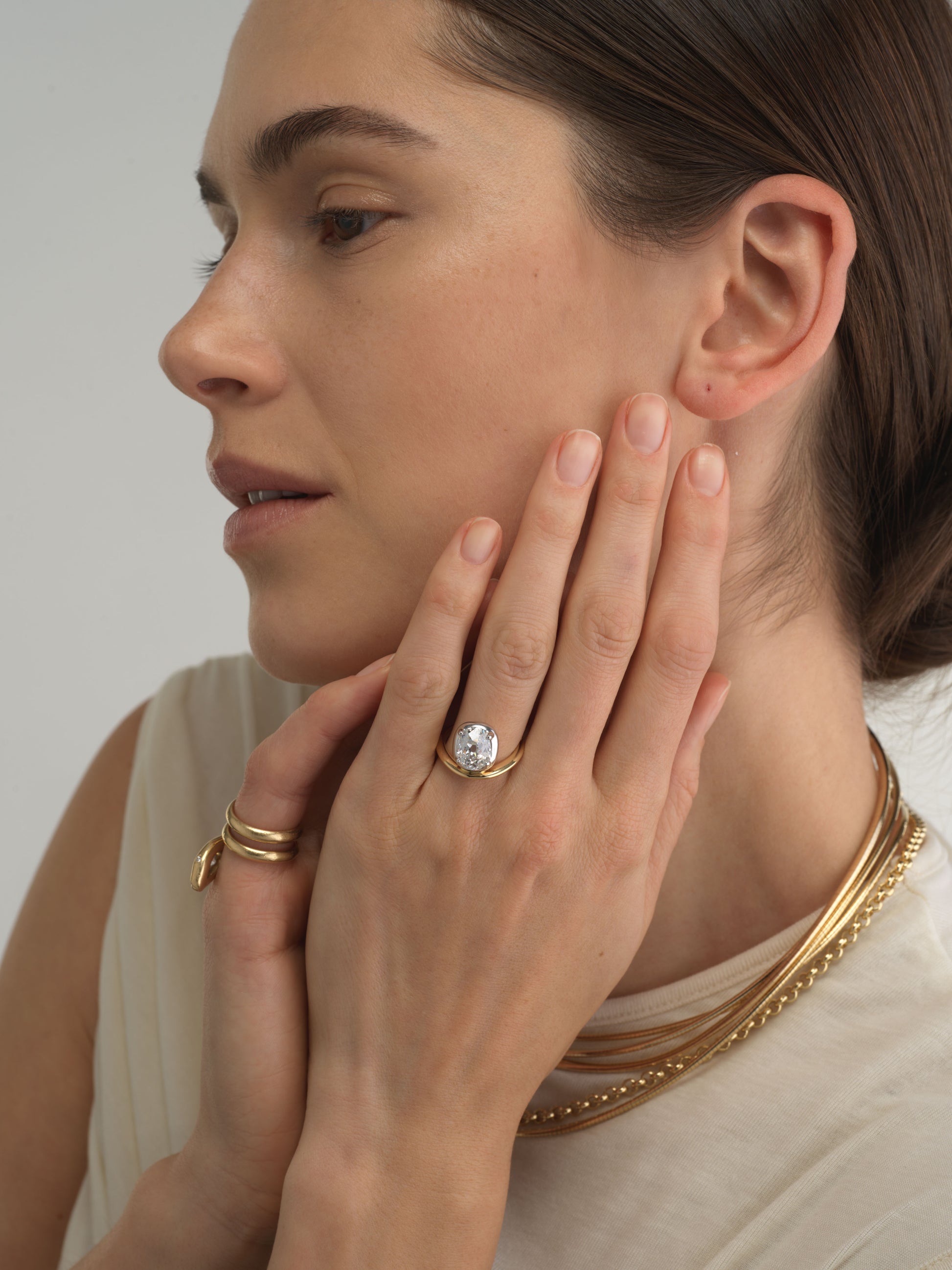 The Perch is the epitome of quiet luxury. The stunning center stone sits delicately on a sinuous gold band creating a unique silhouette and just the right amount of tension. A real conversation piece, it is substantial enough to be worn on its own, or try stacking it with our Perch Bands.