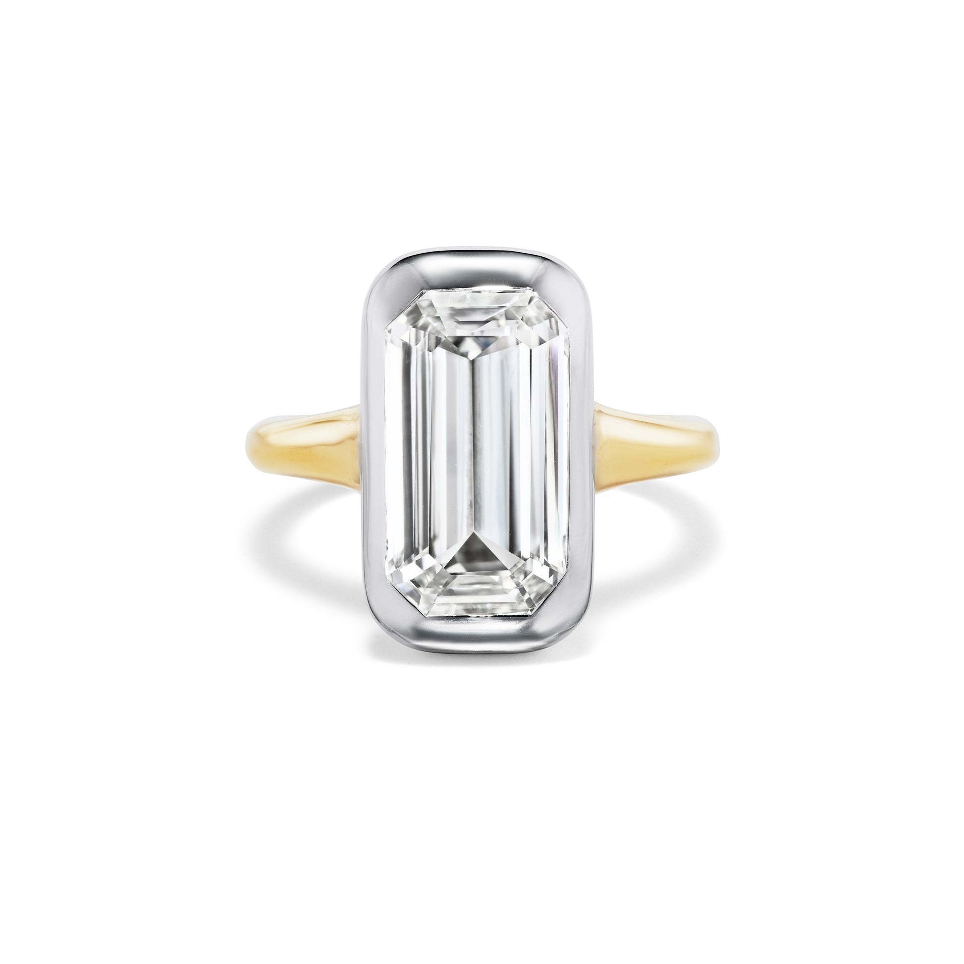 The Sera Ring is for the bride who wants a new take on a classic design. Featuring a sleek, tapered band and smooth bezel setting, The Sera is ultra-modern and ultra-flattering. We find it looks particularly fetching with elongated stones, such as pears, marquises, and emerald cut diamonds.