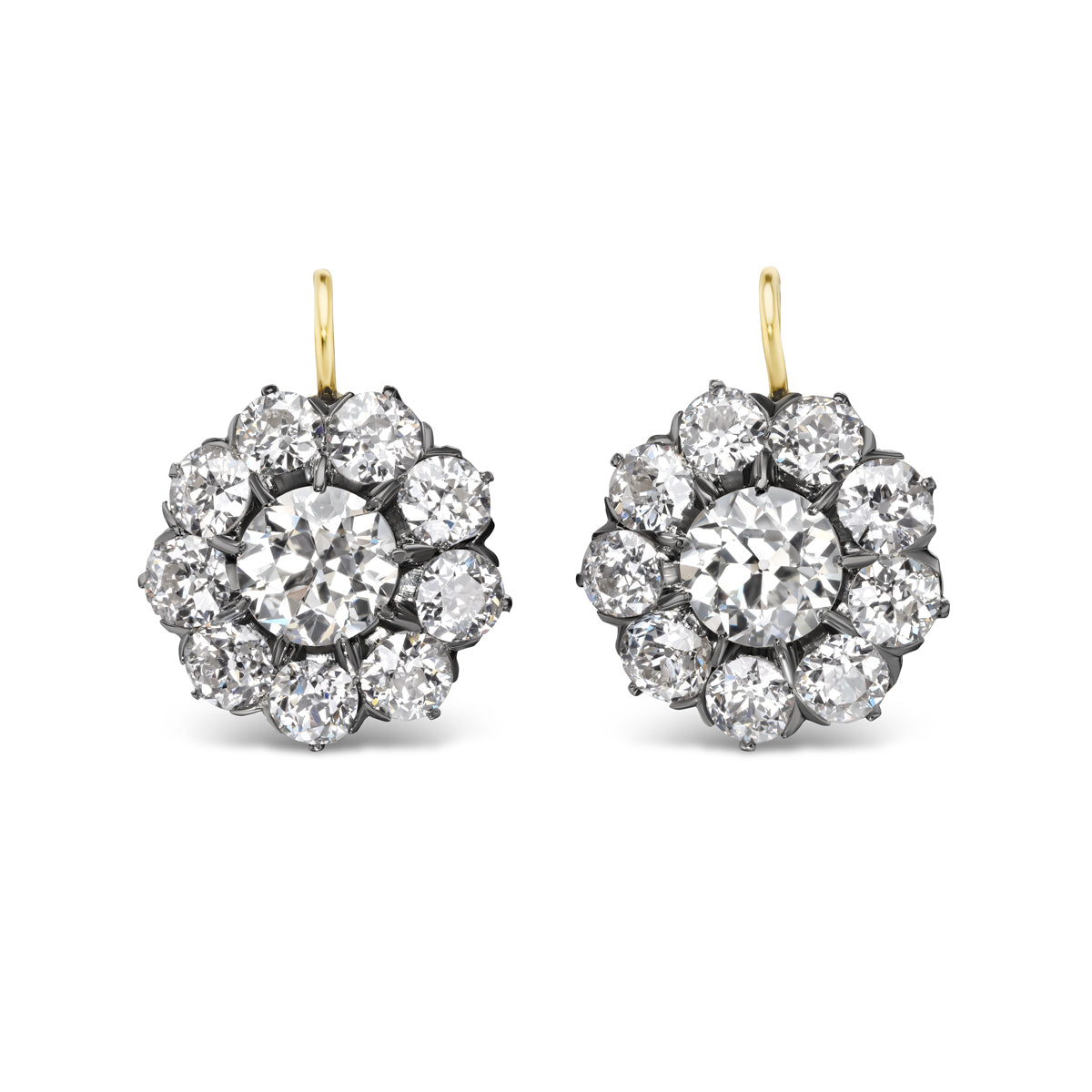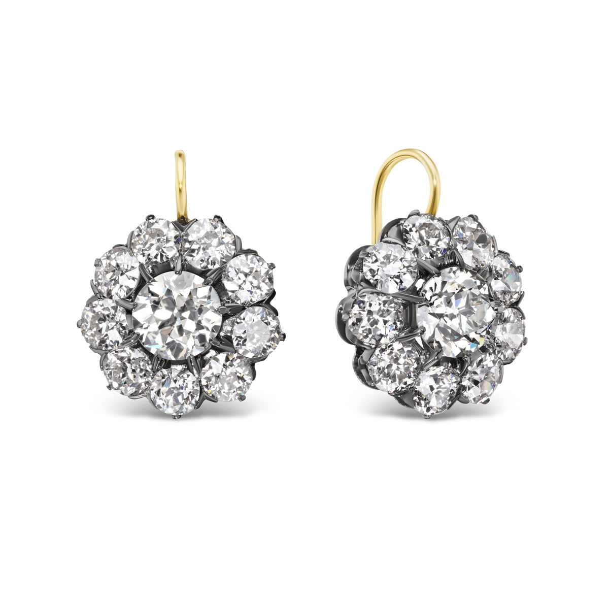 These flower drop earrings are a stunning example of Victorian Era craftsmanship: cut and set entirely by hand. Featuring 8 carats of old mined diamonds set in blackened gold, we've added 18k yellow gold hoops for contrast and comfort.