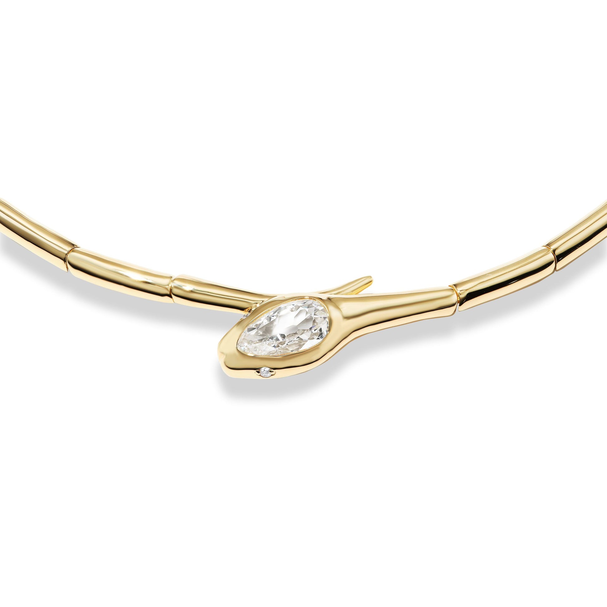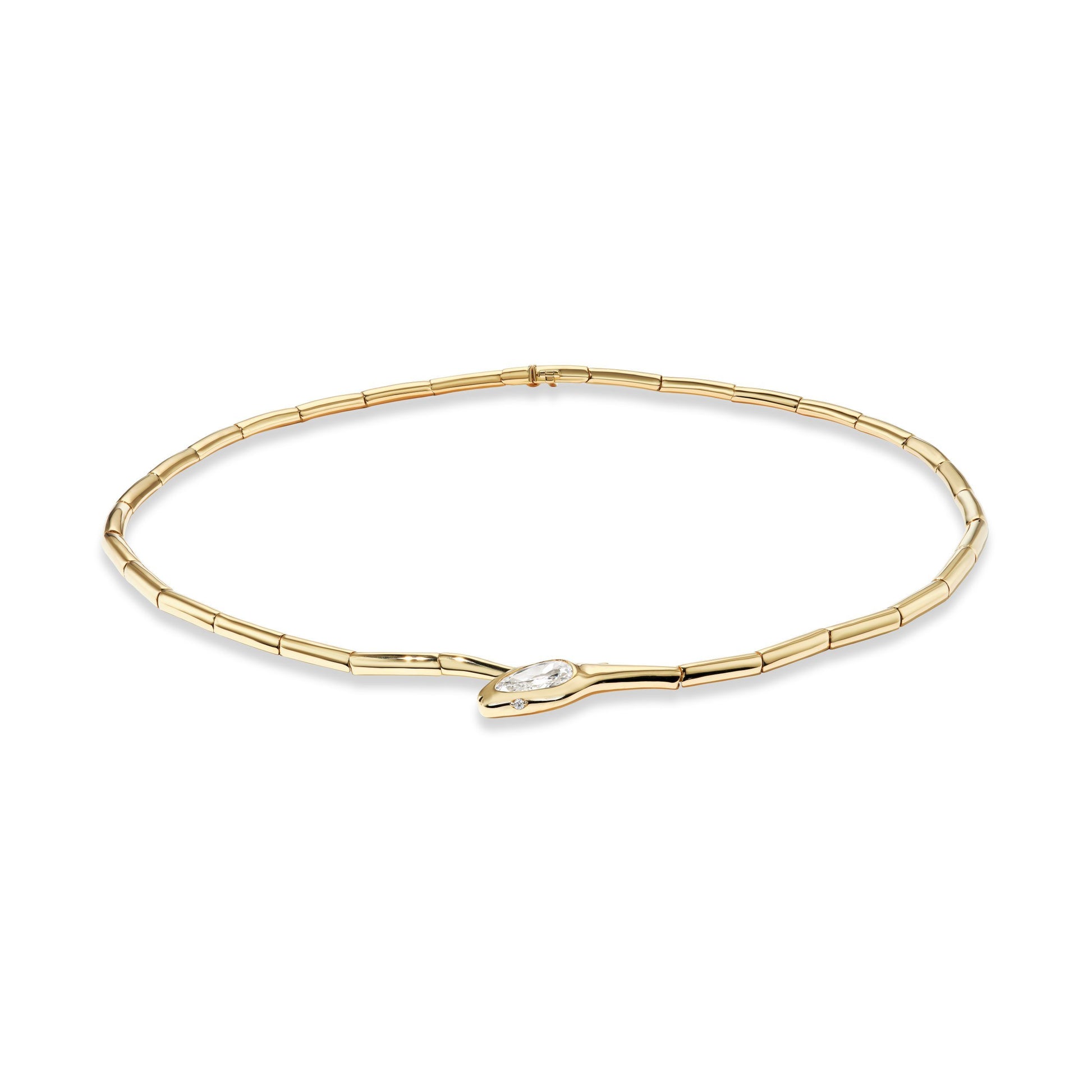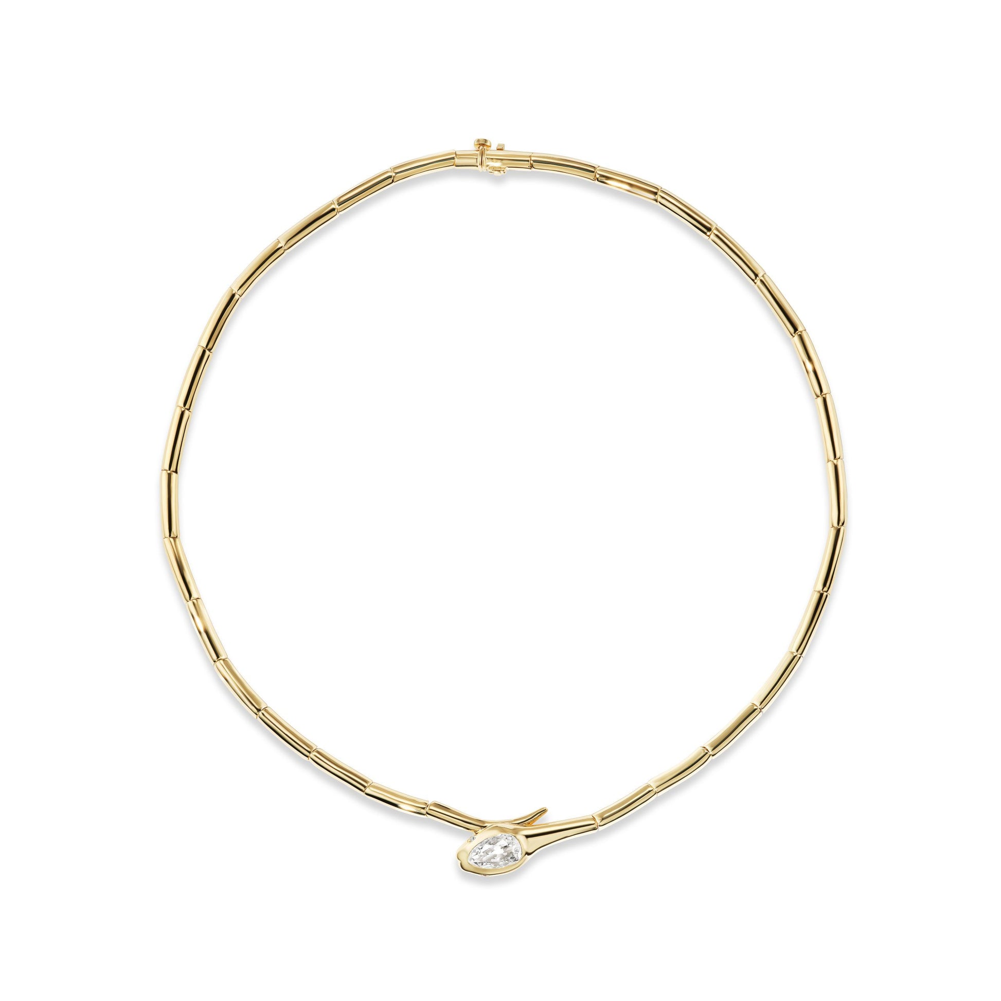 The Single Diamond Serpent is a seductive, playful twist on the classic gold collar necklace. Measuring 16" long with a hidden box clasp for added security.