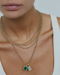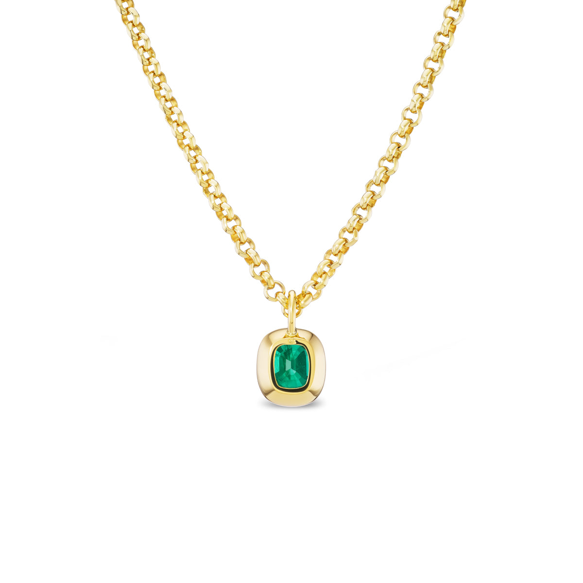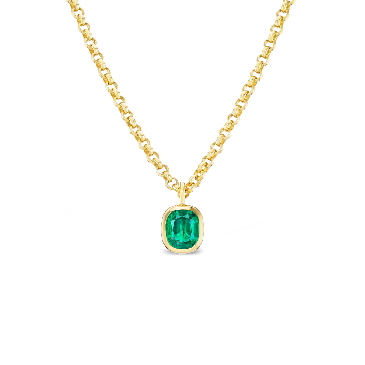 This pendant features a stunning 6+ carat Zambian emerald, renowned for its vibrant green hue. Set in a refined gold bezel, this piece combines timeless elegance with durability, offering an effortlessly chic look. Pair it with our Rolo or Omega chain.