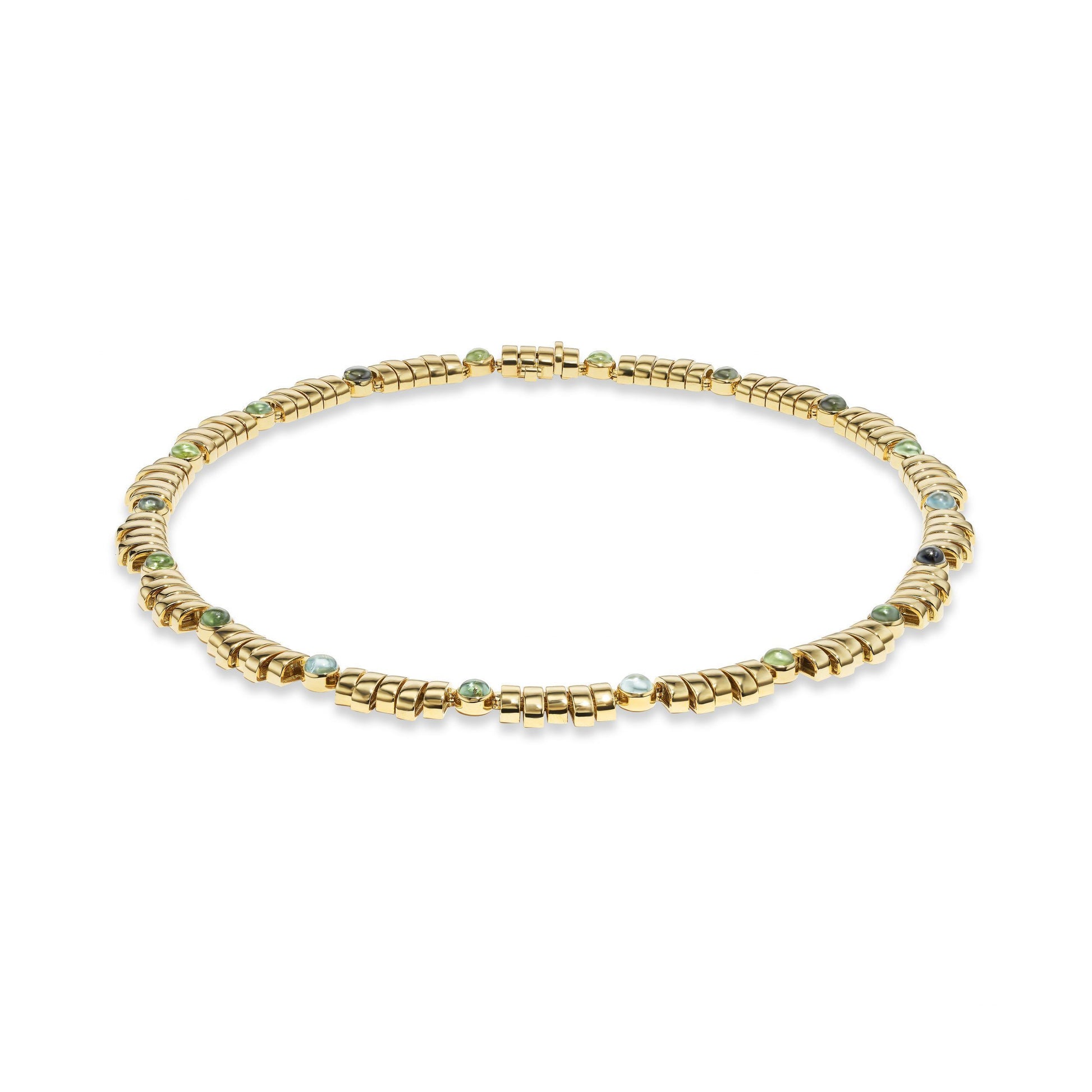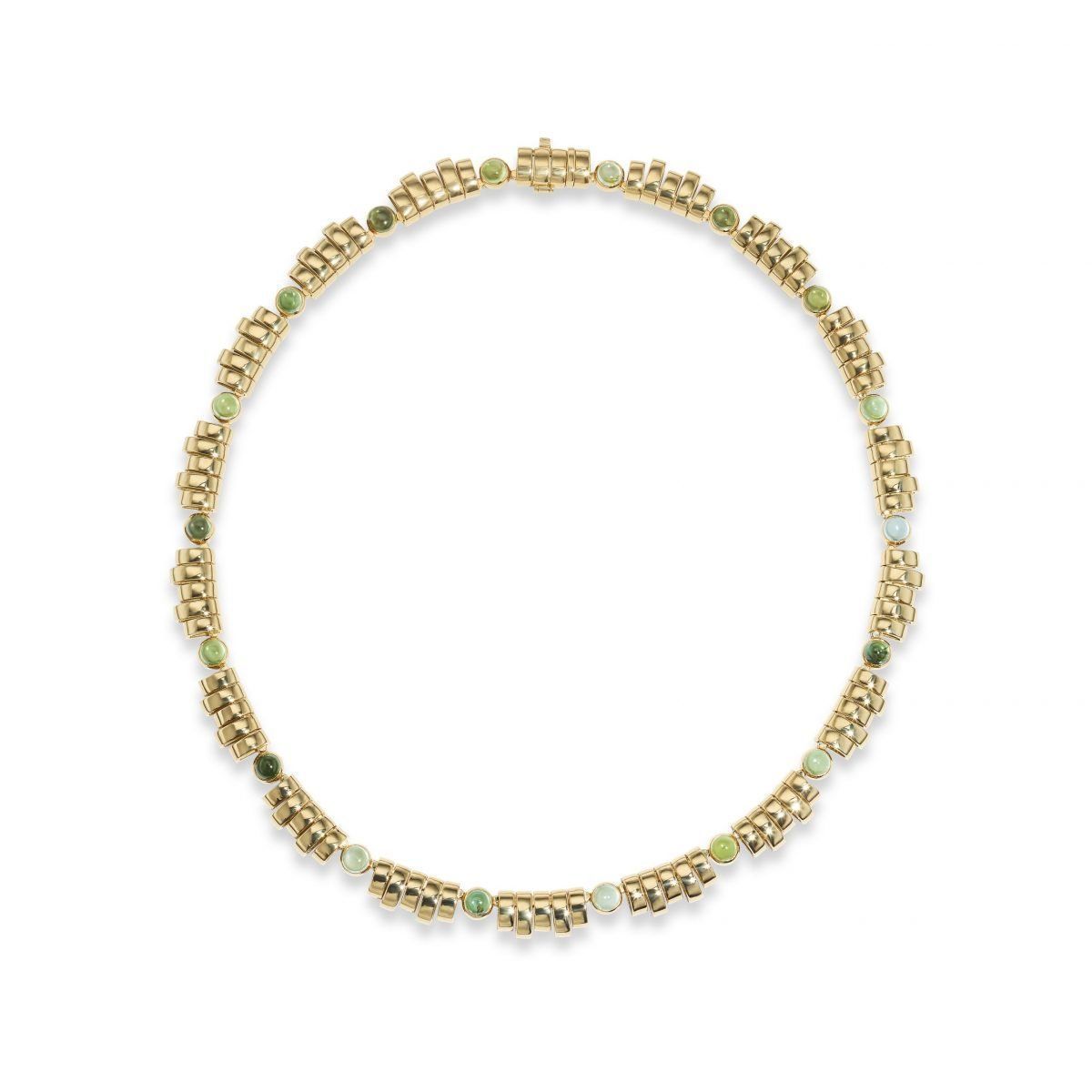 Another showstopper in the Gatsby Collection. Each link of the Gatsby Gold and Cabochon Collier is constructed and assembled by hand. Punctuated with blue-green tourmaline cabochons, it can be dressed up or down for any occasion.