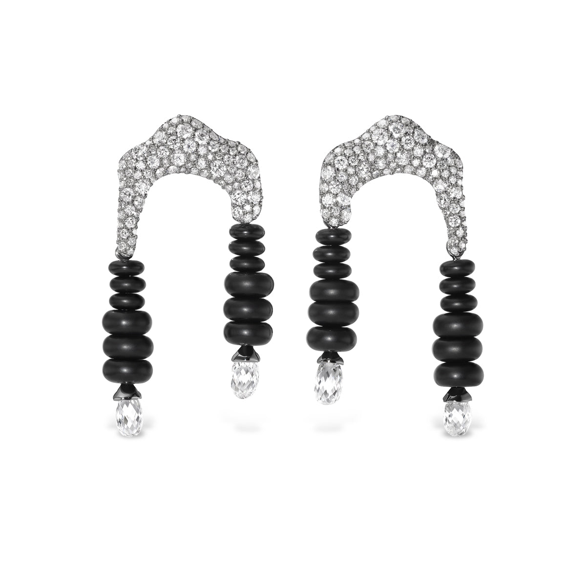 As their Spanish name suggests, The Boda Earrings are the perfect bridal accessory. A marriage of sparkle and tradition, the pavé posts feature two diamond briolettes on either end. The abstract shape was derived from our Flora collection: it widens and narrows, ebbs and flows across the ear making a statement worthy of an updo.